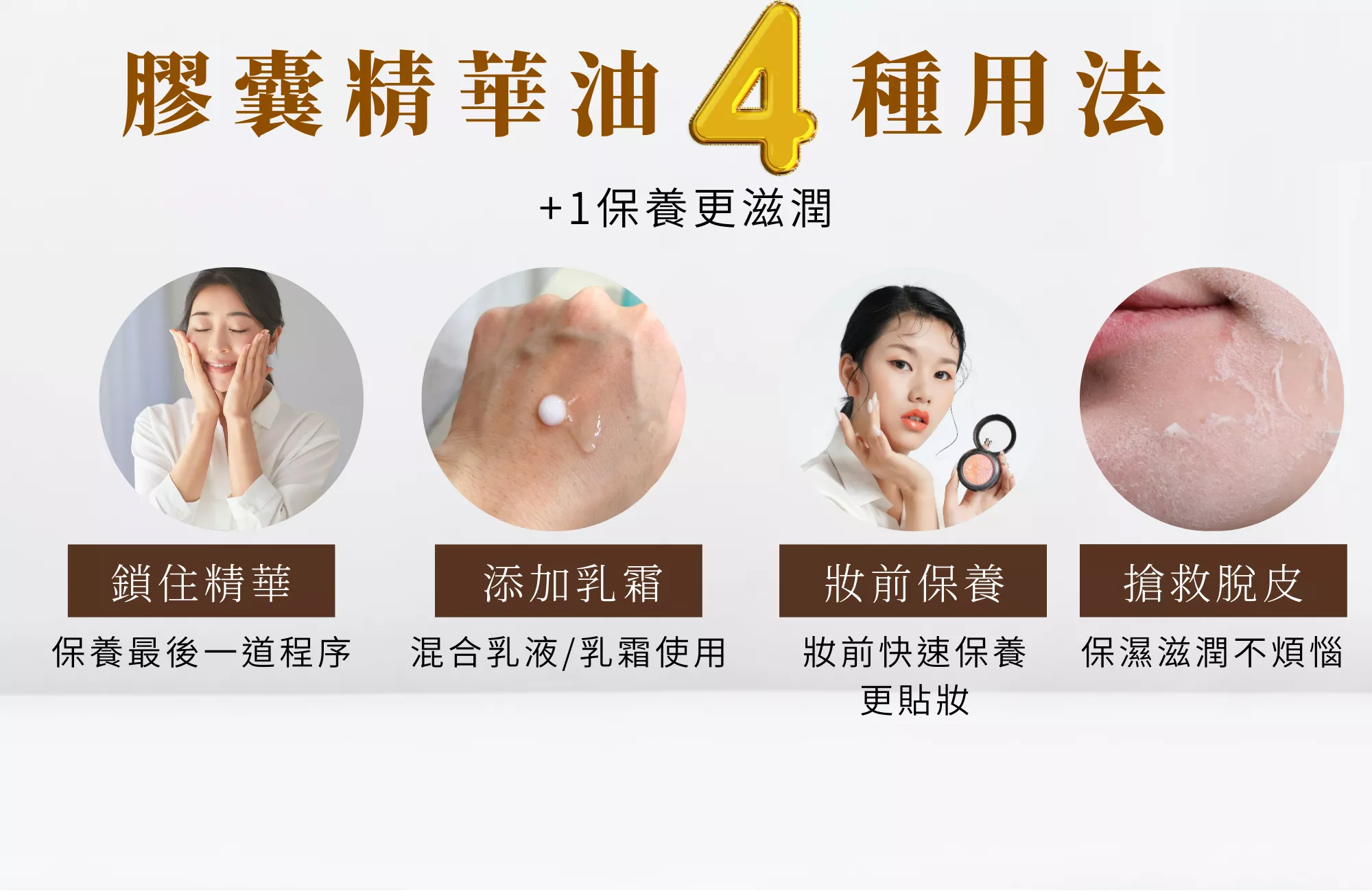 膠囊尾端剪開後,擠出精華油,塗抹於全臉或乾燥或脫皮部位,使用在保養最後一道程序。
